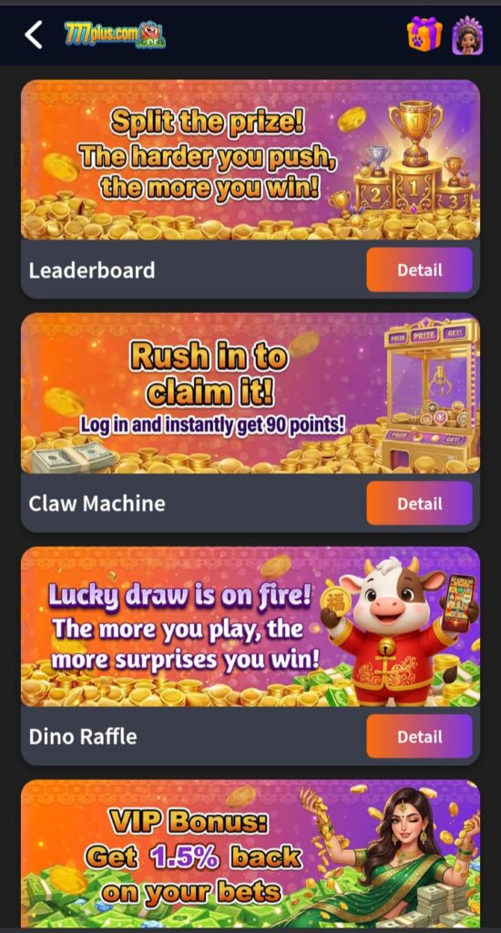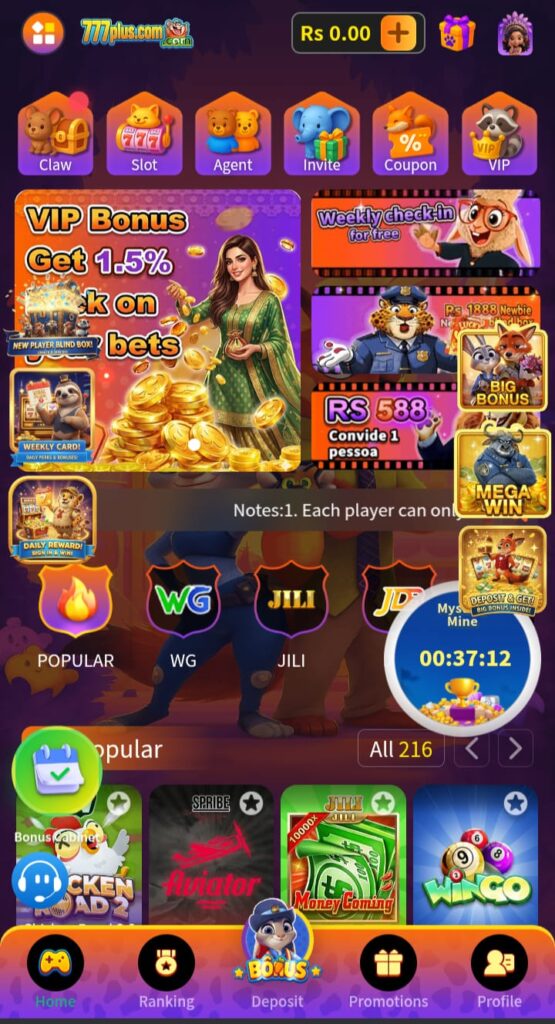 Earn 4% from the invited player’s recharge, daily earnings 4% on deposit, and 2% commission. Receive 25% weekly cashback, Aviator millionaire challenge, daily check-in cumulative bonus, 8 times per day Max drop Rs288888, Super daily and monthly rewards, 7% bonus deposit, agent level prize, win a grand prize of 1,000,000. Join the VIP group and get additional bonuses. Finally, download the app and get more bonuses from the 777Plus Game App.